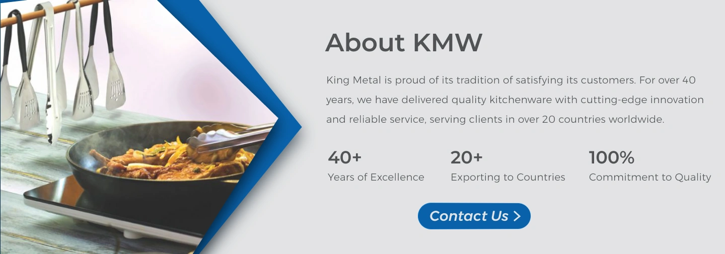 Manufacturers & Exporters of Stainless Steel & Aluminium KitchenwareKMW (King Metal Works) is a trusted kitchenware manufacturer specializing in stainless steel utensils and aluminium kitchen solutions for commercial kitchens, hospitality brands, and modern homes. With over four decades of experience, we deliver durable, performance-